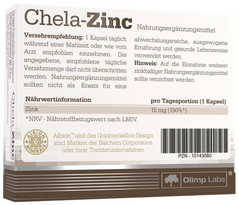 Chela-Zinc - это пищевая добавка, в состав которой входит хорошо усваиваемый бисглицинат цинка. Это хелатный комплекс аминокислот с цинком Albion, который способствует наилучшему усвоению.